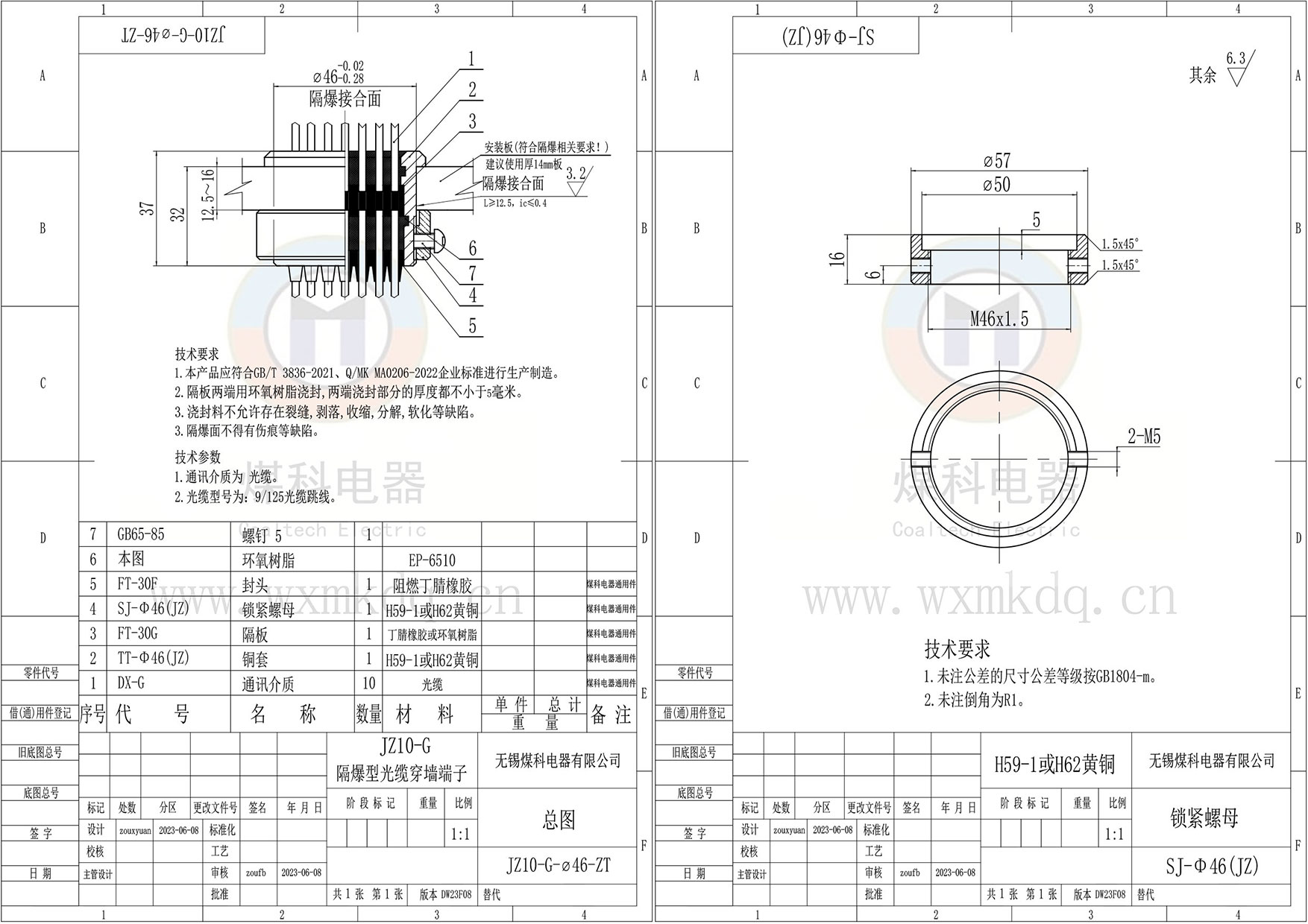 (1)隔爆面安装铜套;(2)芯数;(3)光纤及接头规格;(4)上端(法兰侧)预留多长;(5)下端(锁紧螺母侧)预留多长。